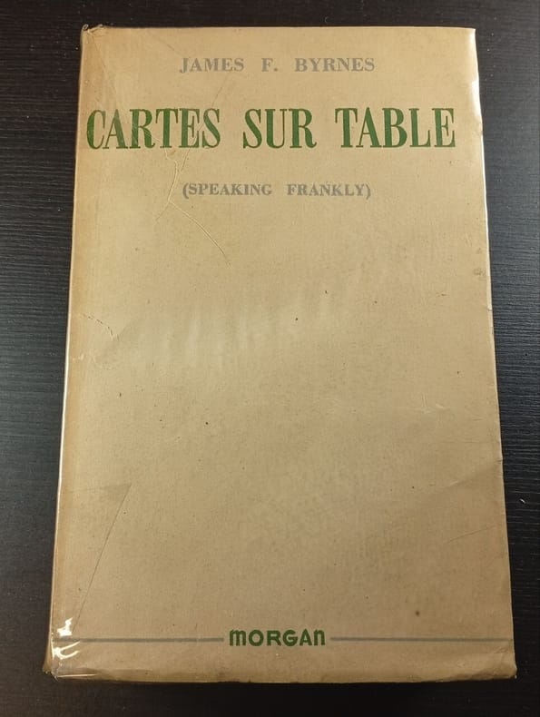 L'histoire des conférences internationales destinées à organiser la paix, de Yalta (1945) à la Conférence de la Paix des 21 Nations (Paris juillet-octobre 1946). — "Les sensationnelles révélations de James F. Byrnes, ancien ministre des Affaires étrangères des USA, conseiller du président Roosevelt, sur les dessous de la politique internationale." (L'Editeur) — "M. James F. Byrnes publie la relation des grandes Conférences internationales auxquelles il a assisté soit comme ministre des Affaires étrangères des U.S.A., soit comme conseiller du président Roosevelt. A ses notes sténographftques d'une exceptionnelle valeur documentaire s'ajoutent les rapports et mémorandums rédigés immédiatement après les conversations par les membres du secrétariat de ces Conférences. C'est un document de 600 pages d'une très grande valeur où l'auteur s'est efforcé « de rendre tant l'esprit que la lettre des déclarations, de relater les événements et de dépeindre l'atmosphère dans laquelle elles se déroulèrent »." (Hommes et mondes, 1948)