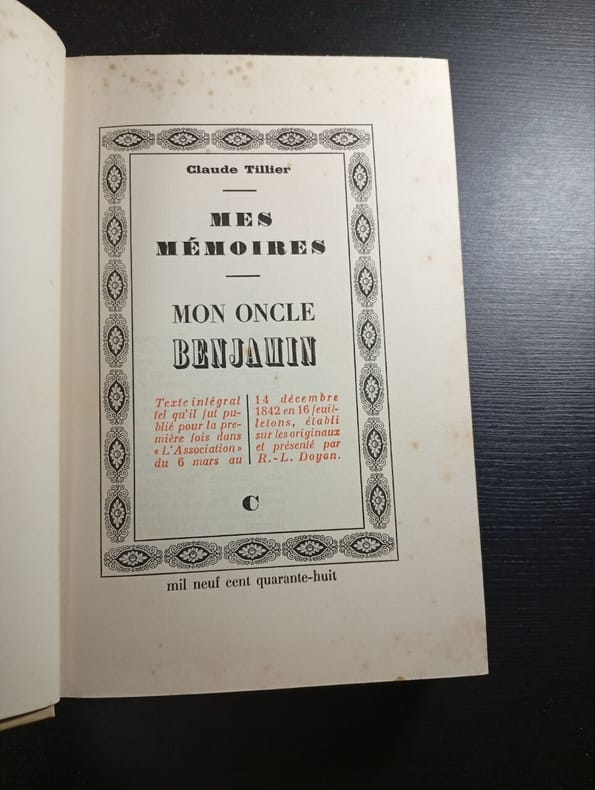 "Club Français du Livre. 1948. In-8. Cartonnage d'éditeurs. Bon état, Couv. convenable, Dos fané, Intérieur frais. 273 pages. Texte intégral tel qu'il fut publié pour la première fois dans ""L'association"" du 6 mars au 14 décembre 1842 en 16 feuilletons, établi sur les originaux et présenté par R.L. Doyon. Exemplaire numéroté 2288 sur 3000.. . . . Classification Dewey : 94.41-Editions numérotées (gros tirage)"