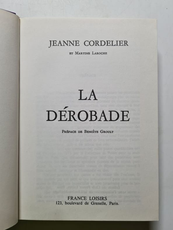 Hachette Sans date. La Dérobade est un roman autobiographique dans lequel Jeanne Cordelier raconte sans filtre ses années de prostitution décrivant l'horreur d'une servitude humiliante où l'on exploite la naïveté et où l'on monnaie l'amour