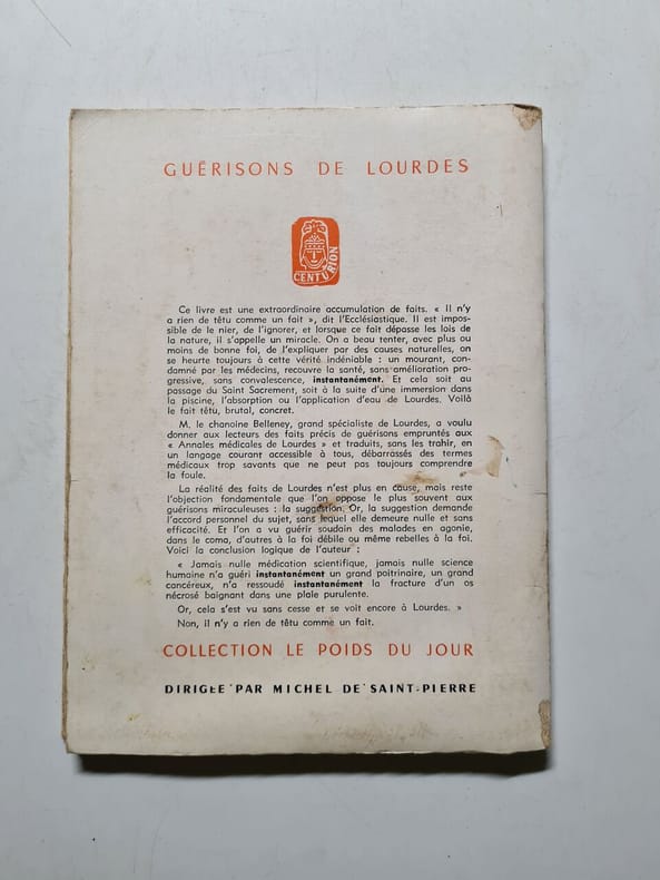Sommaire; A la grotte de Lourdes - Guérisons - Les aveugles voient - Les sourds entendent - Les boiteux marchent - Tuberculoses - Maux de pott - Plaies fermées - Cancers & fibromes - Que d'autres cas encore ! - Science & miracles - Conclusion. vol in-8, 190x14, relié demi cuir, dos à nerfs, 130 pages photographies hors texte, couvertures d'origines conservées, bel exemplaire ! Édition du Centurion 1955 ref/98