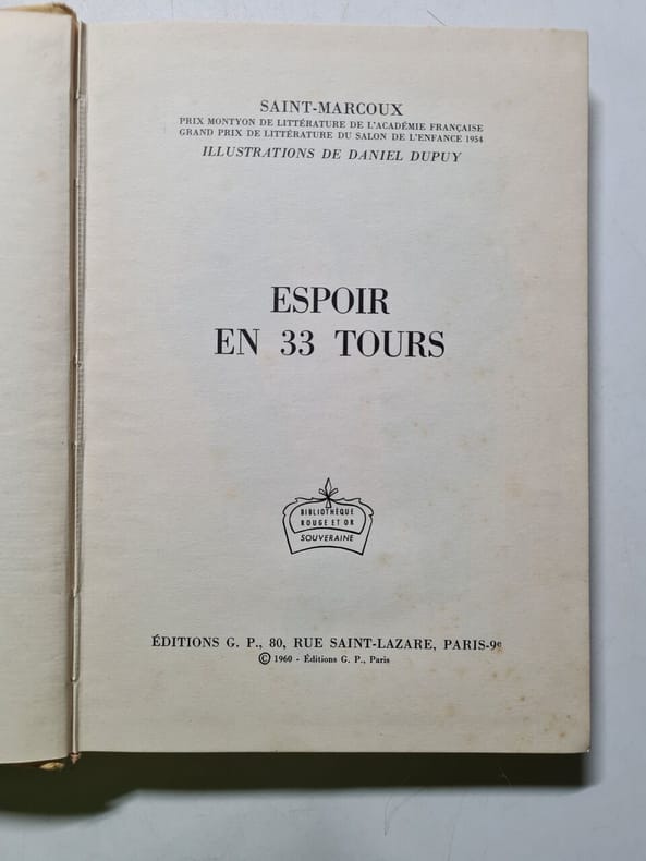 G.P. Rouge et Or Souveraine Cartonné avec jaquette 1960 Cartonnage crème in-8 (15 x 21 cm.), jaquette illustrée couleurs, dos rouge, 186 pages, illustrations en couleurs et noir et blanc, 1er tirage ; traces à la jaquette (4e plat principalement), intérieur frais, bon état. Livraison a domicile (La Poste) ou en Mondial Relay sur simple demande.