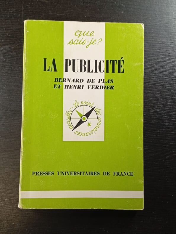 5eme édition remaniée et mise à jour, 1970 Contents, Chapitres : Table, xxv, Texte, 578 pages - A. Généralités : 1. Théorie et technique de la publicité : Définition et nature de la publicité - Principes économiques de la publicité - Principes psychologiques de la publicité (Mobiles d'action des individus, Tendances, Emotions et passions - Mécanisme d'influence sur un esprit - Mécanismes d'action de la publicité, Perception et attention, Compréhension, Mémoire, Croyance, Action - La foule, Caractères de la foule, Facteurs des croyances de la foule, Moyens de persuasion de la foule - La publicité et la morale - 2. Pratique de la publicité : Les moyens de publicité (Presse, achat d'espaces, annonce - Radio et télévision, Achat de temps, Utilisation du temps, Controle d'achat de temps et de programmes - Publicité directe, Lettres de publicité directe, Dépliants et brochures, Contrôle de la publicité directe - Cadeaux, Cadeaux comme moyen de vente, Cadeaux comme sujet de publicité, Comme moyen de publicité - Affichage, Achat d'espace, Affiche - Cinéma, Distribution de films, Production de films - Etalage et expositions, Emplacement d'étalage ou d'exposition, Réalisation d'un étalage ou d'une exposition - Relations publiques - B. Organisation rationnelle de services et agences de publicité : Service ou agence de publicité (Professions publicitaires - Annonceur et agent-conseil de publicité) - Fonctionnement théorique d'une agence ou d'un service de publicité, Organisation générale, Fontionnement de chaque service - Annexes 2 petites taches claires sur le plat supérieur du cartonnage éditeur qui reste en très bon état, sans jaquette papier, intérieur sinon frais et propre, papier à peine jauni, cela reste un bon exemplaire de cet ouvrage dressant un vaste panorama des techniques de publicité dans les années 1970, avec plusieurs chapitres intéressants sur la manipulation des foules et la psychologie