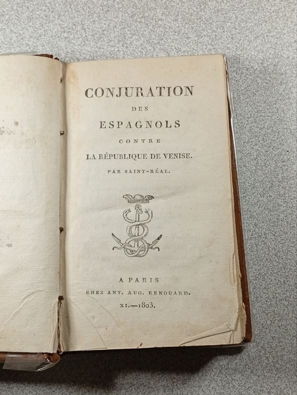 La Conjuration des Espagnols contre la République de Venise en l'année M. DC. XVIII, publiée en 1674, se veut purement historique. Il sera considéré comme une œuvre majeure de l'écriture historique classique par certains de ses contemporains et par les défenseurs du classicisme aux XVIIIe et XIXe siècles, durant lesquels il connaîtra d'innombrables rééditions. César Vichard, abbé de Saint-Réal (1639 - 1692). Introduction et notes de Albert Lombard. Avec un portrait gravé sur bois par Achille Ouvré.