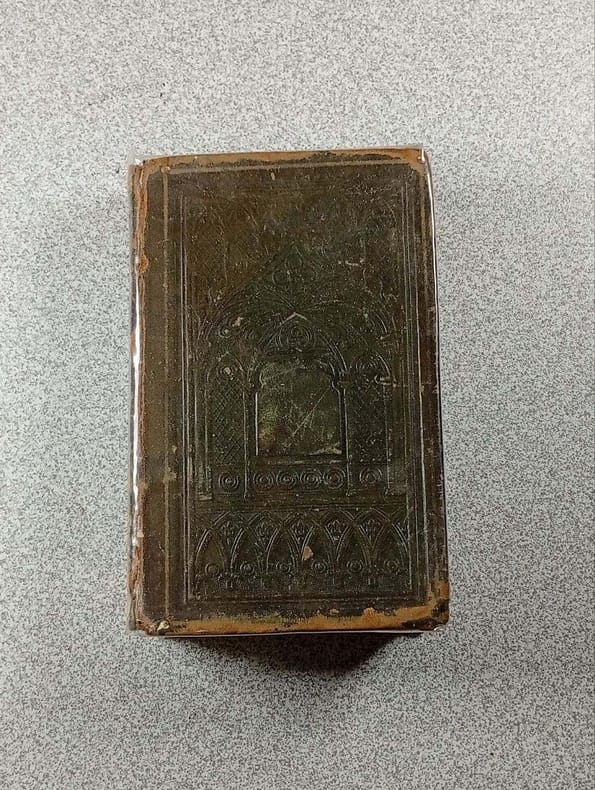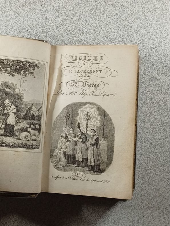 Paris D. Belin, libraire 1829 un volume in-32° (75 x 115Mm), (2) 380 (2) pp. Reliure d'époque "à la cathédrale" en basane vert olive, dos lisse orné d'une pièce de titre, de filets et palettes dorées et d'un décor à froid, filet et pointillé ainsi qu'un décor à froid à "la cathédrale" sur les plats, roulette sur les chasses, tranches dorées. (reliure légèrement frottée, petit manque de cuir à la coiffe supérieure, frottis aux coins, présence de rousseurs parfois soutenues). Charmant livre de piété orné d'un frontispice, d'une vignette de titre et d'un hors-texte lithographié. De l'imprimerie E. Pochard.
