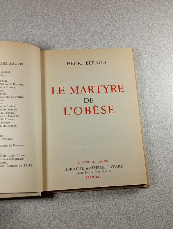 Broche bon etat sous papier cristal . Ex. numerote. Texte tres propre .Pages non coupees. Le martyre de l'obèse. 1950. 161pages.