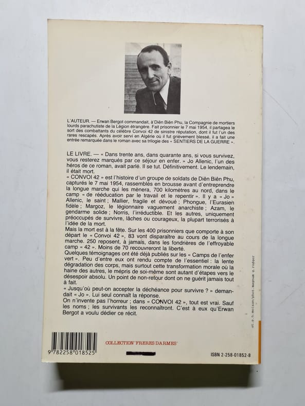 Le calvaire des soldat français prisonniers après la bataille de Diên Biên Phu est ici raconté à travers le martyre des 400 hommes du convoi ˮ42ˮ. Tout est vrai sauf les noms. 70 hommes seulement recouvriront la liberté; 83 vont disparaître au cours de la longue marche et 250 reposent à jamais dans les fondrières de l'effroyable camp ˮ42ˮ. ˮUn livre hallucinant, pathétique, presque intolérable...C'est un récit, une chronique de l'horreur, du desespoir, traversé de fulgurantes lueurs de courage et d'honneur... ˮConvoi 42ˮ est un livre qui fait mal au coeur et à la raison.ˮ Pierre Darcourt. A lire avec ˮLe manifeste du camp n°1ˮ de Jean Pouget.