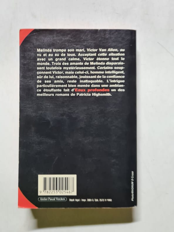 Le livre de poche 2026 350 pages 11 0cm x 18 0cm x 1 6cm. 2026. broché. 350 pages. patricia highsmith eaux profondes Vic Van Allen tolère les multiples flirts de sa femme Melinda avec une patience qui stupéfie tout le monde. Jusqu'au jour où l'un des anciens amants de celle-ci ayant été tué il se vante d'être l'assassin. Toutefois le meurtrier est arrêté. Melinda rassurée commence une nouvelle liaison. Et cette fois-ci Vic assassine l'amant... Melinda qui a compris la vérité choisit alors la voie la plus redoutable : le défi. C'est trop tenter le diable. Tous - Vic également - l'apprendront à leurs dépens. Un suspense psychologique envoûtant comme seule sait les créer la romancière de Mr Ripley et de L'Inconnu du Nord-Express