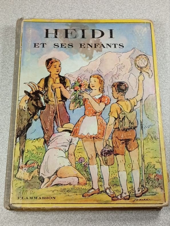 Heidi six volumes reliure éditeur, demi-toile verte titre au dos doré, premier illustré en couleurs. Flammarion éditeur. 1) Heidi jeune fille faux-titre titre 153 pages, illustrations dans le texte et hors-texte de JODELET. Premier trimestre 1950. 2) Heidi et ses enfants premier trimestre 1950. 3) Heidi grand-mère illustrations de Jean BERTHOLD premier trimestre 1950. 4) Le sourire d’Heidi 151 pages, illustrations d’André PEC quatrième trimestre 1955. 5) Au pays d’Heidi illustrations de JODELET deuxième trimestre 1941. 6) Kornelli illustrations de JODELET quatrième trimestre 1952. L’ensemble en très bon état