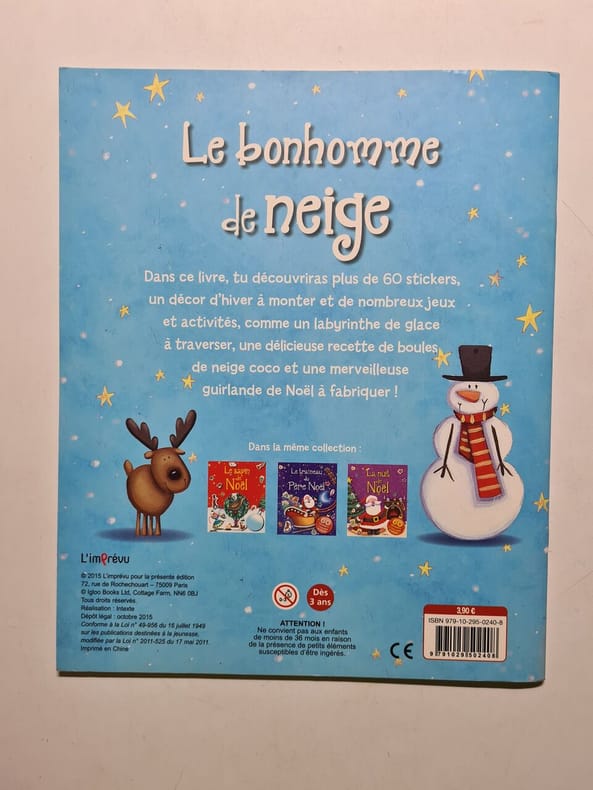 LITO. NON DATE. In-16. Relié. Bon état, Couv. convenable, Dos satisfaisant, Intérieur frais. 10 pages cartonnées- illustrations en couleurs dans et hors texte- accompagné d'une peluche bonhomme de neige de 14 cm environ. . . . Classification Dewey : 843.0692-Livres d'enfants