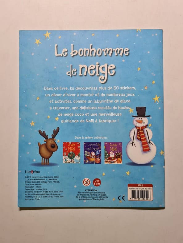 LITO. NON DATE. In-16. Relié. Bon état, Couv. convenable, Dos satisfaisant, Intérieur frais. 10 pages cartonnées- illustrations en couleurs dans et hors texte- accompagné d'une peluche bonhomme de neige de 14 cm environ. . . . Classification Dewey : 843.0692-Livres d'enfants
