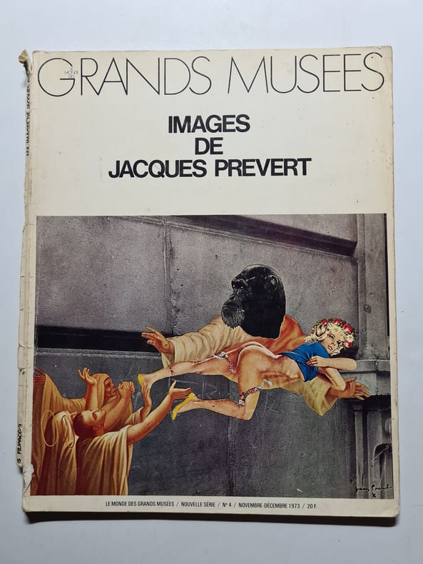 Paris Maeght 1957 In 4 broché couverture illustrée, 46 pages. Texte de René Bertelé sur papier rouge, 19 collages de Prévert reproduits en pleine page. Tirage limité à 1500 exemplaires numérotés. Petite déchirure à la couverture sinon bel exemplaire.