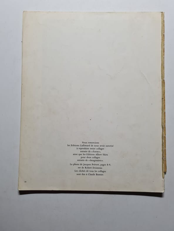 Paris Maeght 1957 in-4 broché sous couverture rempliée illustrée en couleurs 46p. 19 collages de Prévert reproduits à pleine page en noir et blanc. Tirage limité à 1500 exemplaires numérotés.(n°8). Envoi de René Bertelé. PETITE MOUILLURE EN BAS DE CERTAINES PAGE N'AFFECTANT PAS LES ILLUSTRATIONS. (voir photos)