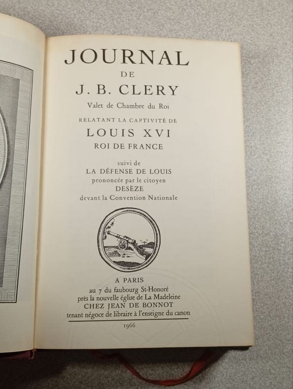 1966, Jean de Bonnot, in-8 plein cuir rouge, titrages, décors et tête dorés, signet, Journal de J.B. Cléry, valet de chambre du Roi, relatant la captivité de Louis XVI, roi de France, suivi de La défense de Louis prononcé par le citoyen Desèze devant la convention nationale, le texte reproduit en fac-similé l'édition originale du journal de Jean-Baptiste Cléry, orné d'un frontispice, 2 planches, avec en plus une série de gravures concernant les événements de la Révolution | Etat : Très bon état (Ref.: REF101268)