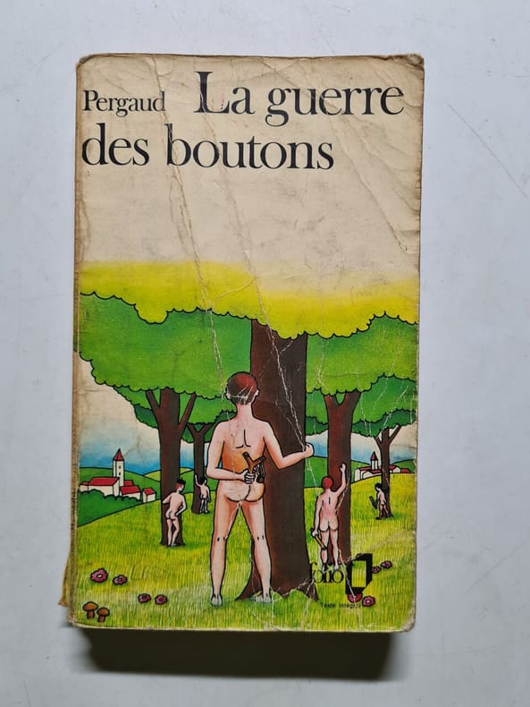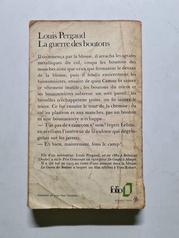 La Guerre des boutons est un roman français écrit par Louis Pergaud, écrivain franc-comtois, et publié en 1912. Il décrit la « guerre » que se livrent les bandes d'enfants de deux villages rivaux, Longeverne et Velrans, dans la campagne franc-comtoise de la fin du XIXe siècle. L'auteur s'est inspiré de la vie dans le village de Landresse, dans le département du Doubs, où il a enseigné deux ans. Le titre vient du butin de cette guerre, constitué en majorité par les boutons dont les vaincus sont dépouillés par les vainqueurs. Le récit, pour la plus grande partie, raconte l'histoire du point de vue des enfants de Longeverne. Louis Pergaud remporta le prix Goncourt avec De Goupil à Margot, Histoire de bêtes en 1910, mais c'est avec La Guerre des boutons qu'il rencontra le succès. Il fut tué près de Marchéville (dans les environs de Verdun) le 4 avril 1915. Insolation au dos et légères usures et salissures à l'étui.