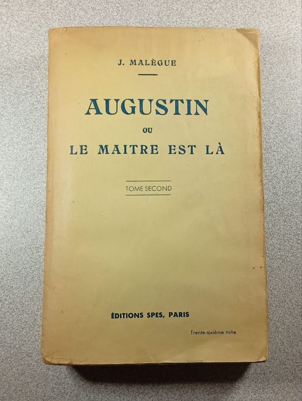 NOTA : Joseph Malègue est un écrivain français né le 8 décembre 1876 à La Tour-d'Auvergne, mort à Nantes le 30 décembre 1940 / Le 28 août 1923, à Nantes, il épouse Yvonne Pouzin, première femme praticien hospitalier en France, alors âgée de 39 ans. Elle va jouer un rôle décisif dans la carrière de son mari. Elle l'aide moralement à compléter puis à faire publier le manuscrit d'Augustin ou Le Maître est là. Ce roman, qui paraît en 1933, consacre tardivement le parfait inconnu qu'est Malègue jusque-là comme « un grand de la littérature ». Cinq décennies plus tard, Émile Goichot le considère toujours comme « le roman du modernisme ». Il souligne fortement l'importance de l'intelligence dans la démarche de la foi, face à cette plus grande crise du catholicisme qui le frappe en plein coeur. Dans ce roman « philosophique » et de la mort de Dieu (Lebrec), racontant beauté des femmes, splendeur des paysages, ironie des situations, sons, couleurs, odeurs, la pensée jaillit du récit concret pour marquer durablement ses lecteurs jusqu'au XXIe siècle avec des gens comme André Manaranche ou le pape François etc... Classification Dewey : 840.091-XX ème siècle