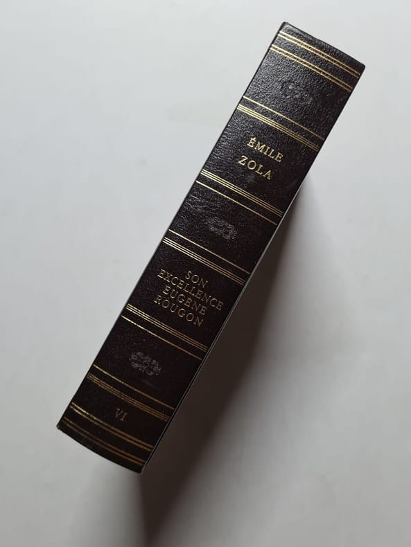 1983, Jean de Bonnot, in-8 plein cuir de 495 pages, plats estampés à froid, titrage et ornements dorés sur dos, tête dorée, signet, frontispice, illustrations de l'époque de l'auteur, Les Rougon-Macquart, histoire naturelle et sociale d'une famille sous le Second Empire, Son excellence Eugène Rougon | Etat : Très bon état général (Ref.: Ref88255)