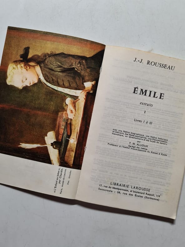 Edition à la date de l'originale, troisième édition parisienne in-12° publiée à Paris chez Duchesne, selon McEachern, illustrée de 5 planches par Eisen, gravées par Le Grand, Longueil et Pasquier.Un des rares exemplaires à comporter le "Supplément à l'Emile" en pagination séparée à la suite du tome IV, dans une composition typographique différente. 'Emile et Sophie', suite peu connue de "l'Emile", désenchantée et déprimée, est demeurée inachevée par Rousseau. "Cest le roman expérimental de l 'Emile'. Rousseau veut mettre ses deux élèves à lépreuve de la nécessité pour vérifier leur liberté intérieure devant les aléas de lexistence. Comment vont-ils assumer lune un adultère malgré elle, lautre une rupture dont il se sent victime? " (cf. Frédéric S. Eigeldinger, Ed. Champion).Selon McEachern, qui se base sur le filigrane, cette édition serait antidatée et n'aurait pas été publiée avant 1774 et pour 'Emile et Sophie' après 1780, date de la première édition. Collation des faux-titres et titre conforme à la description donnée par McEachern.(Cohen, 436. McEachern, n°7, p. 123. Gagnebin, n°7-8, p. 1868).Reliure abîmée: mors fendillés, coiffes usées, épidermures, galerie de vers. Bon était intérieur.