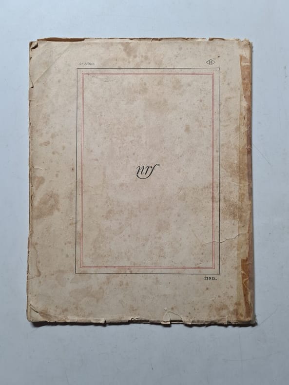Paris, éditions de la Nouvelle revue Française 1924. In-4 broché (28 x 21 cm), non folioté (56 pages) EDITION ORIGINALE au tirage limité, celui-ci l'un des 550 exemplaires numérotés sur Vergé baroque à barbes (n° 174). Premier livre de l'auteur à paraître sous pseudonyme. Quelques plis ou petites déchirures sans manques sur le dos, plats en bon état, intérieur très frais.