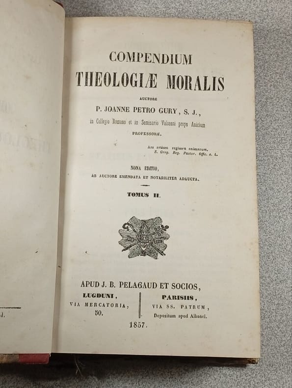 J.-B. PELAGAUD. 1865. In-12. Relié demi-cuir. Etat d'usage, Coins frottés, Dos satisfaisant, Intérieur frais. 680 pages. Dos de cuir vert, titres et filets dorés. Papier vert et noir sur les plats frottés. Texte en latin. Étiquette et tampons de bibliothèque.. . . . Classification Dewey : 230-Christianisme. Théologie chrétienne