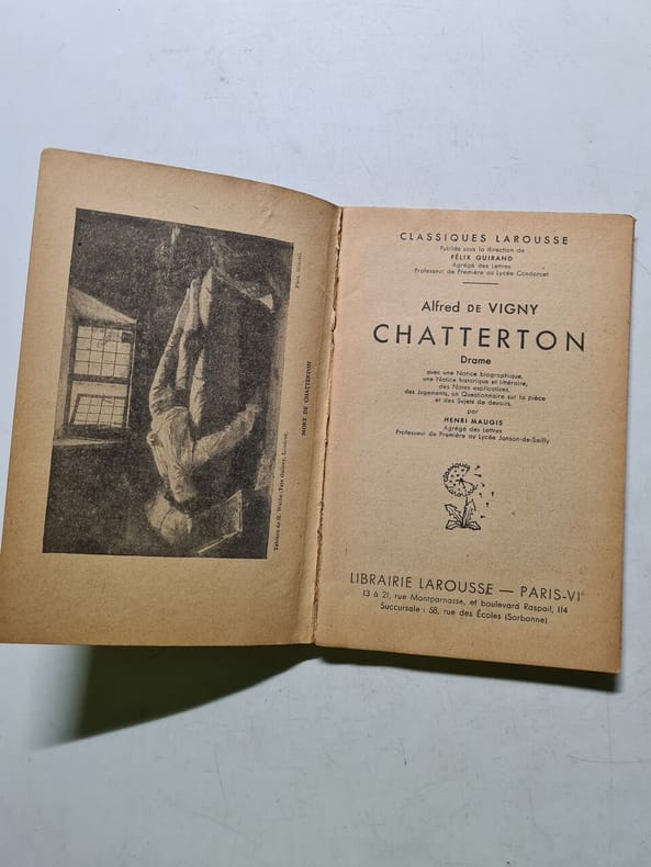 Exemplaire exceptionnel, venant d'un lot d'ouvrages provenant de la bibliothèque de la sociétaire de la Comédie Française Emile Broisat. La pièce de Chatterton est annotée en de nombreux endroits d'une main inconnue, mais très certainement celle d'Emilie Broisat, qui reprit en 1877, pour la Comédie-Française, le rôle de Kitty Bell. Etat très satisfaisant (coiffe sup. lég. frottée).