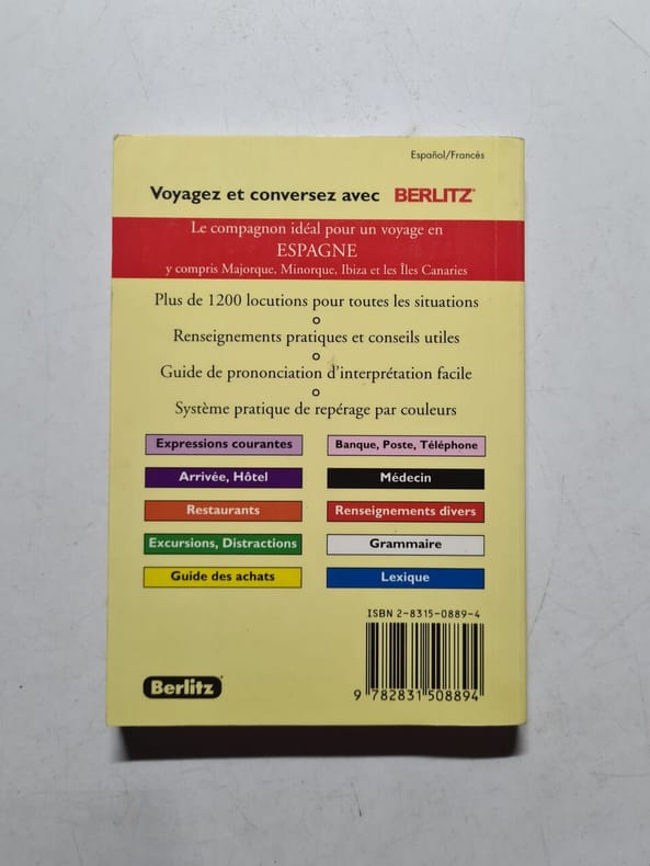 Berlitz. 1996. In-16. Broché. Bon état, Couv. convenable, Dos satisfaisant, Intérieur frais. 191 pages - texte en français et en espagnol.. . . . Classification Dewey : 460-Langues espagnole et portugaise