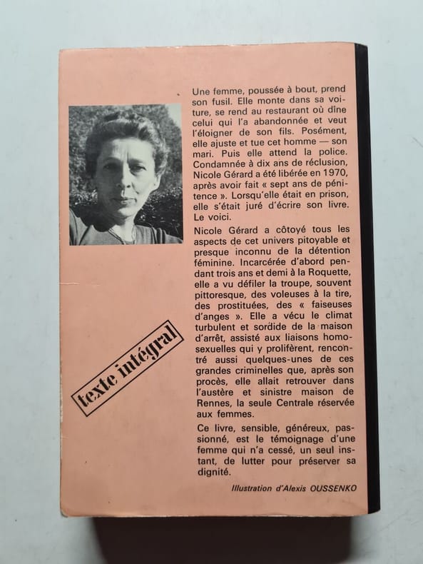 Une femme, poussée à bout, prend son fusil. Elle monte dans sa voiture, se rend au restaurant où dîne celui qui l'a abandonnée et veut l'éloigner de son fils. Posément, elle ajuste et tue cet homme – son mari. Puis elle attend la police. Condamnée à dix ans de réclusion, Nicole Gérard a été libérée en 1970, après avoir fait « sept ans de pénitence ». Lorsqu'elle était en prison, elle s'était juré d'écrire son livre. Le voici. Nicole Gérard a côtoyé tous les aspects de cet univers pitoyable et presque inconnu de la détention féminine. Incarcérée d'abord pendant trois ans et demi à la Roquette, elle a vu défiler la troupe, souvent pittoresque, des voleuses à la tire, des prostituées, des « faiseuses d'anges ». Elle a vécu le climat turbulent et sordide de la maison d'arrêt, assisté aux liaisons homosexuelles qui y prolifèrent, rencontré aussi quelques-unes de ces grandes criminelles que, après son procès, elle allait retrouver dans l'austère et sinistre maison de Rennes, la seule Centrale réservée aux femmes. (...) Un document passionnant.