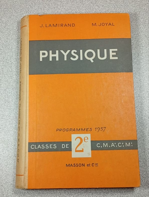 Masson et Cie 1961 296 pages in8. 1961. Reliure editeur cartonnée. 296 pages. Manuel de physique destiné aux classes de seconde (séries A et B) du système éducatif français publié par Masson et Cie entre les années 1940 et 1960. Co-écrit par J. Lamirand et M. Joyal il suit les programmes officiels (comme celui de 1945) et propose un enseignement structuré avec figures lectures exercices et problèmes