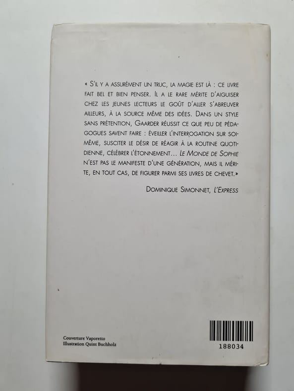 En compagnie de Sophie, âgée de 14 ans, le lecteur est initié par le détour de la fiction romanesque aux grands moments de la pensée occidentale : Socrate, Platon, Aristote, le Moyen Age, la Renaissance, Spinoza, Hegel, Marx, Freud, le post-modernisme... - Passionnant, un livre qu'on a de la peine à poser.