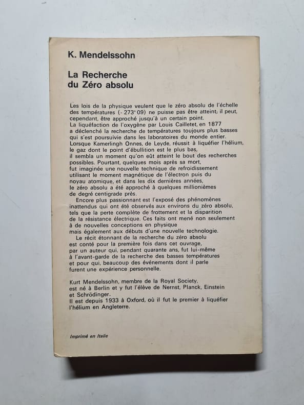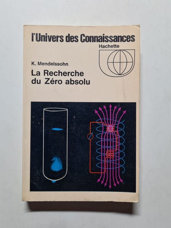 quelques figures et schémas dans le texte en noir et blanc 1ere traduction en français, 1966 Contents, Chapitres : Paris 1877 (Georges Cailletet) - Cracovie 1883 (Szygmunt Florenty von Wroblewski) - Londres 1898 (Sir James Dewar) - Leyde 1908 (Kamerlingh Onnes) - La troisième loi - Les Quanta - Le principe d'incertitude - Le refroidissement magnétique - La supraconductivité - Bibliographie, remerciements, index bel exemplaire, couverture propre, intérieur frais et propre
