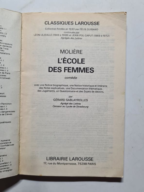 Larousse Sans date. L'École des femmes est une comédie de Molière qui critique les relations conjugales et l'éducation des femmes au XVIIe siècle à travers l'histoire d'Arnolphe un homme qui tente d'épouser sa pupille Agnès après l'avoir élevée dans l'ignorance