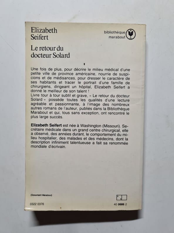 Editions Marabout. Collection Bibliothèque.Série Romans Médicaux. Roman traduit de l'américain par Eliane Leclercq. Classification Dewey : 840.091-XX ème siècle