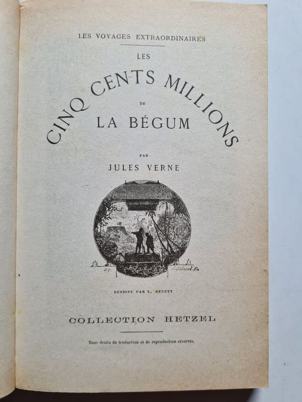Bibliothèque d'éducation et de récréation J. HETZEL et Cie, éditeurs, 18, rue Jacob, sans date (1878) 1879 Deux semestres reliés en un volume grand in-8°, (4) 380 pp. - (4) 380 pp. Reliure ancienne en demi-toile bleue, dos lisse orné du titre et de l'année en doré, filets estampés à froid. (petites fentes aux coiffes, coupes frottés, plis au second plat, ressauts de cahier, présence de rousseurs pâles, rares petites coupures marginales). Texte sur deux colonnes. Contient " LES 500 MILLIONS de LA BÉGUM " de Jules VERNE, illustré de dessins par H. Meyer, Une carte en page 7 sur le tome XXVIII.