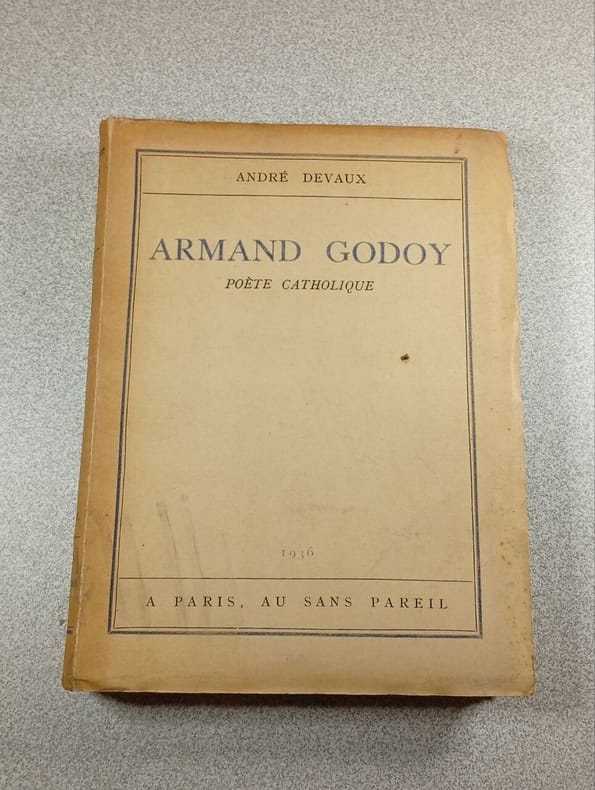 3 vol. in-12 br., Quatre Nocturnes traduits par Armand Godoy, Emile-Paul Frères, Paris, 1929, 42 pp. [ Livre dédicacé par l'auteur ] [ Avec : ] Armando Godoy, Poeta Frances, Prensas de la Editorial Ercilla, Santiag de Chile, 1935, 361 pp. [ Avec : ] La Poesia de Armando Godoy, Préface de Jean Royère, Editorial Iberia, Madrid, Barcelona, Valencia, s.d. [ circa 1932-1933 ], 55 pp. [ Livre dédicacé par l'auteur ]
