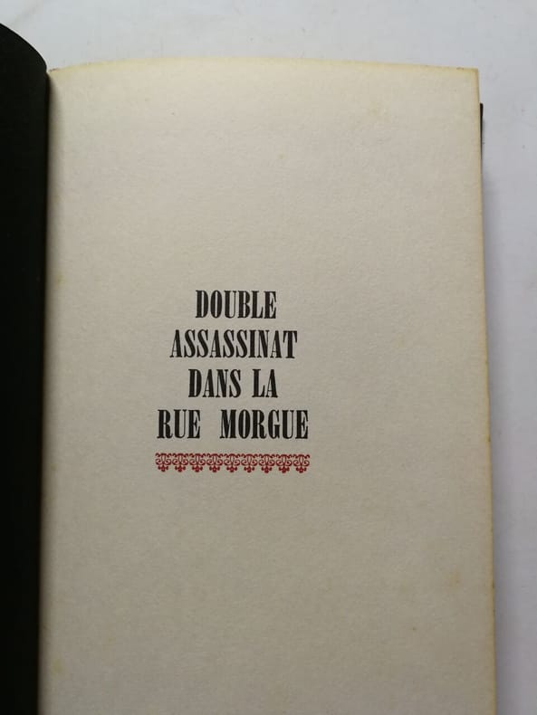 André Sauret, Éditeur, coll. « Douze Meilleurs Romans Policiers » 1969 Volume 7 complet du roman “double assassinat dans la rue Morgue” de la collection “Douze Meilleurs Romans Policiers”. In-8 reliure éditeur pleine peau chagrinée rouge. Sans étui. Dos lisse avec titre doré, plats avec double filet doré en encadrement. Tranche supérieure dorée. 22,5 cm sur 16,5. 263 pages. Frontispice. Lithographies originales en couleurs hors-texte de Carzou. Très bon état d’occasion