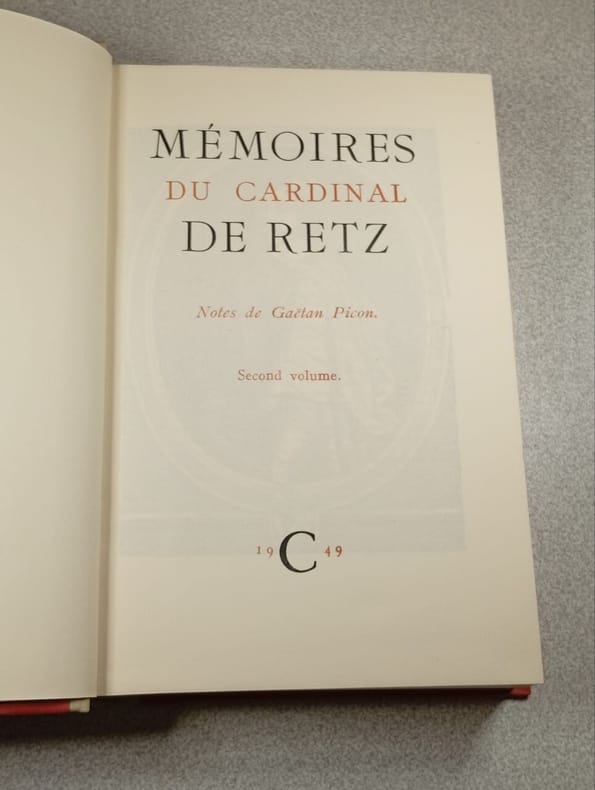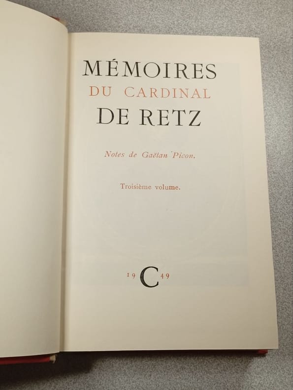 où, de succès scolaires en succès mondains, de succès oratoires et d'amours fougueuses en intrigues politiques, un jeune abbé noble, sans vocation, devient un remueur de foules : le redoutable coadjuteur, âme de ces jeux de princes révoltés qu'on appela la Fronde... . A Paris, Les Amis de l'Histoire 1968, reliure éditeur avec dos et 1er plat très orné en noir, rouge et or, 12x20cm, 411+409+382 pages sur bouffant alfa vergé, collection "Mémoires pittoresques et libertins", une illustration couleur en frontispice et nombreuses illustrations hors texte.