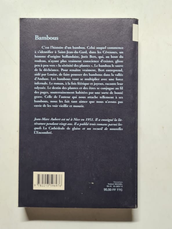 Paris Fayard 1996 Grand In-8 C'est l'histoire d'un bambou . Celui auquel commence à s'identifier à Saint-Jean-du-Gard , dans les Cévennes , un homme au bout du rouleau .Il entreprend de faire pousser des bambous dans la vallée d'Anduze . Les bambous vont se multiplier avec force . C'est le destin conjugué des plantes et des êtres que l'auteur nous décrit joyeusement ici . - 228 p. , 450 gr. .