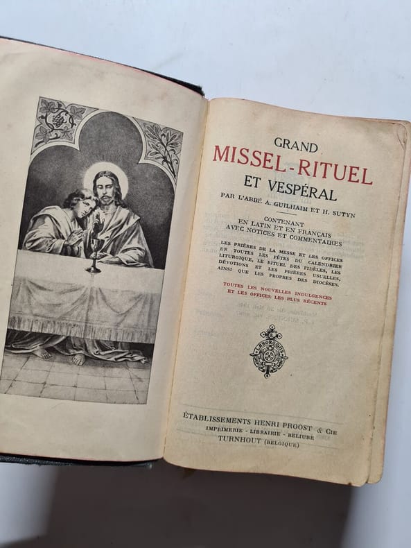 "2. Turnhout (Belgique), Etablissement Henri Proost & Cie, s.d. (approbatio 1961), in-12°, 15 x 9 cm, coloured frontispiece + xlix pp + 1853 pp , contains printed music. publisher's full brown leather, embossed blindtooled and gilt decoration on front cover, all edges gilt, matching half cloth slipcase. Very fine unused copy, printed on extremely thin paper; thickness of the book is 32 mm (for nearly 2000 pp)."