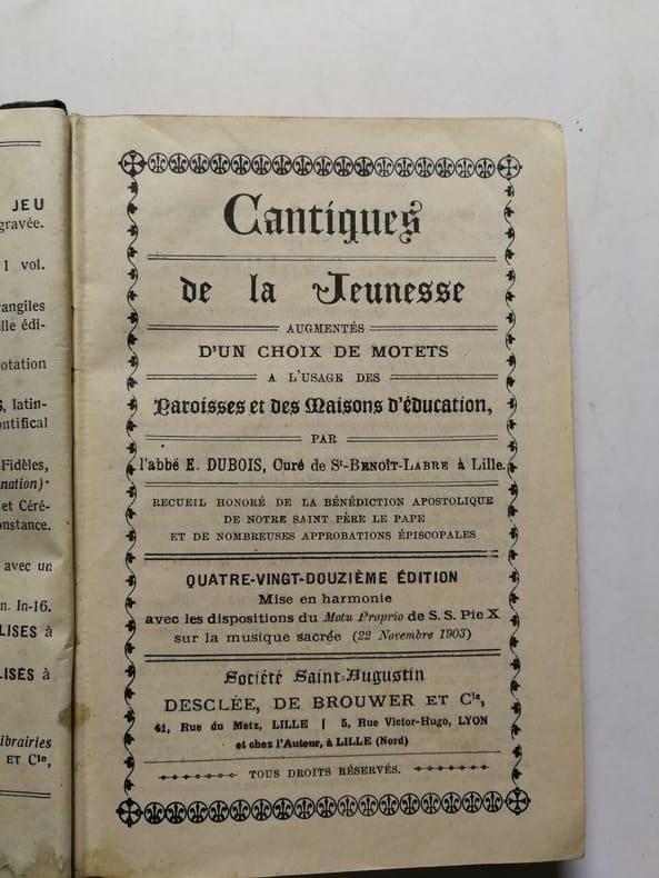 Arras Brunet 1903 1 Un volume de format in 12 de 308 pp. suivi de 60 pp.; "Kyriale ou Chants Ordinaires de la Messe" édition Desclée de Brouwer. Reliure de l'éditeur en pleine percaline noire, estampée; titre doré mais effacé au dos; tranches rouges. Ouvrage entièrement consacré aux partitions avec les textes joints.