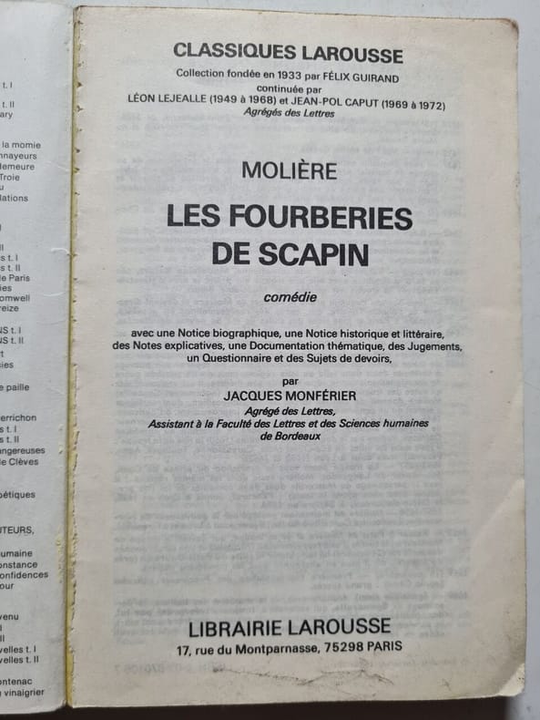 Editions Larousse 1972 1972. Molière: les fourberies de Scapin/ Nouveaux Classique Larousse 1972 . Molière: les fourberies de Scapin/ Nouveaux Classique Larousse 1972