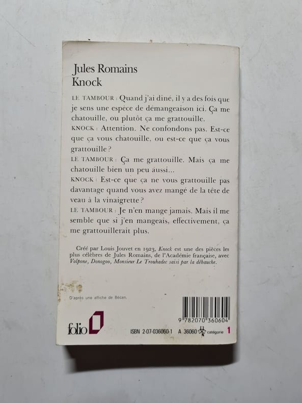 Gallimard / Folio 1972 160 pages 11 0cm x 18 0cm x 1 0cm. 1972. broché. 160 pages. LE TAMBOUR : Quand j'ai dîné il y a des fois que je sens une espèce de démangeaison ici. Ca me chatouille ou plut t ça me grattouille. KNOCK : Attention. Ne confondons pas. Est-ce que ça vous chatouille ou est-ce que ça vous grattouille ? LE TAMBOUR : Ca me grattouille. Mais ça me chatouille bien un peu aussi... KNOCK : Est-ce que ça ne vous grattouille pas davantage quand vous avez mangé de la tête de veau à la vinaigrette ? LE TAMBOUR : Je n'en mange jamais. Mais il me semble que si j'en mangeais effectivement ça me grattouillerait plus