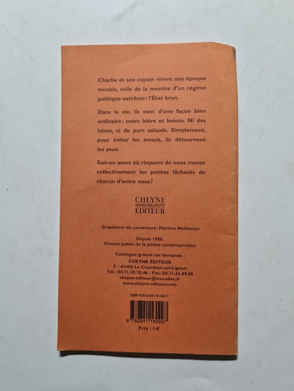 Le Chambon-sur-Lignon. Cheyne. 2002. 11 pp. In-12. Broché. Très bon état. 1 volume. Matin brun ou l'histoire d'amis choisissant par lâcheté et souci du confort de rester passif face à un régime toujours plus dur. Mais cette passivité est-elle vraiment la solution? La réponse ne plaira à personne, fût-il lecteur ou personnage.