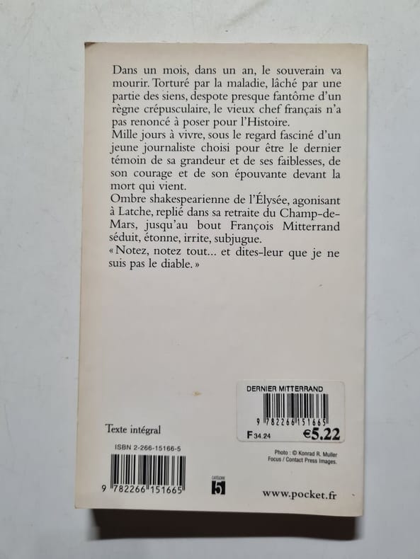 Pendant mille jours, François Mitterrand a eu un interlocuteur privilégié : Georges-Marc Benamou. A la fois compagnon, témoin, convive et mémorialiste. Ce livre raconte l'histoire d'une fin de règne et les heures les plus douloureuses d'une vie. On y entend les échos assourdis de l'ordinaire politique - avec sa cour élyséenne et les Conseils des ministres ; on assiste en spectateur privilégié à la course vers la présidence de la République ; on partage les combats d'un homme face à la maladie, pour éviter de sombrer ; on saisit au vol, parfois, dans l'Elysée crépusculaire ou dans la France des profondeurs, quelques morceaux d'anthologie qui donnent la mesure de ce président hors normes. Les hommes d'Etat ont toujours eu leurs confidents. Seuls les plus grands ont eu le talent de susciter des livres à leur mesure. C'est le cas de celui-ci.
