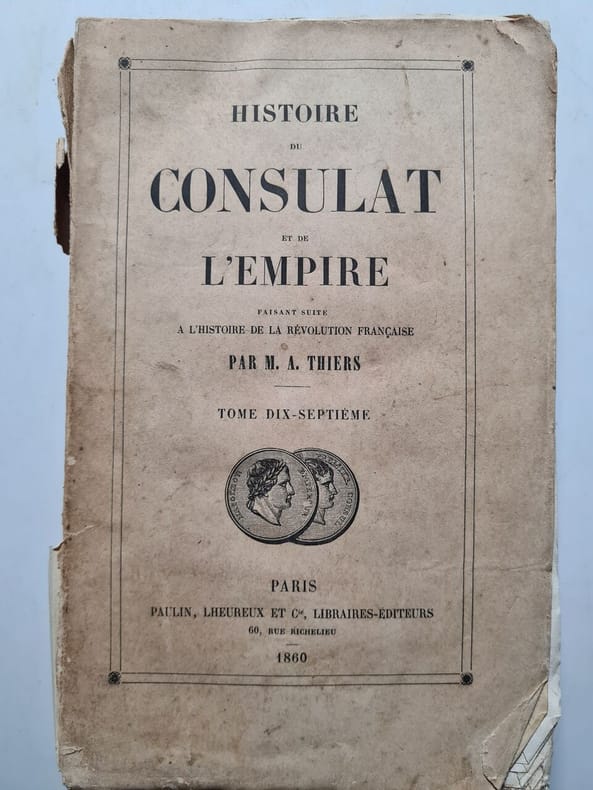 Tome 1: constitution de l'an VIII, administration intérieure, Ulm et Gènes, Marengo - Gravures:portraits de A. Thiers, Bonaparte, Masséna, Bonaparte traverse le Saint Bernard, portrait de Dessaix; Tome 2: héliopolis, Armistice, Hohenlinden, Machine infernale, les neutres - gravures: Kléber à Héliopolis, Talleyrand, Joséphine, Bataille de Hohenlinden, Mort tragique de Paul 1er; Tome 3: évacuation de l'Egypte, Paix générale, Concordat, Le tribunat, consulat à vie - Gravures: Duroc, Beau fait d'armes du capitaine Troude, Pie VII, Revue à lyon de l'armée d'Egypte; Tome 4: les sécularisations, rupture de la paix d'Amiens, camp de Boulogne, conspiration de Georges - Gravures: St. Domingue, Bruix, Combat sur la plage de Boulogne, débarquement de Georges à la falaise de Biville; Tome 5: l'Empire, le sacre, troisieme coalition -gravures: Berthier, Napoléon proclamé empereur (planche double), Fete au camp de Boulogne, Napoléon essuyant le feu d'une frégate anglaise, Napoléon; Tome 6: Gravures: Murat, Trafalgar, le maréchal Mortier au combat de Dirnstein, surprise des points de Vienne, bataille d'Austerlitz, la princesse Pauline Borghese; Tome 7: Gravures: bataille d'Iéna, le maréchal Davout, charge des cuirassiers à Eylau, siege de Dantzig, Oudinat à Friedland...Atlas, dessiné et dressé sous la direction de M. Thiers, par MM. A. Dufour et Duvotenay, gravé sur acier par Dyonne, éditeur Lheureux, 1864. Quelques cartes: Souabe, Suisse, Piémont, vallée du Danube...chaine des Alpes...champ de bataille d'Eylau, de Dantzig, de Friedland, environs de Vienne, places fortes d'Espagne, de la Russie d'Europe, de la route de Wilna à Moscou, de Laon, de la bataille de waterloo.... Classification Dewey : 944.05-Premier Empire, 1804-1815