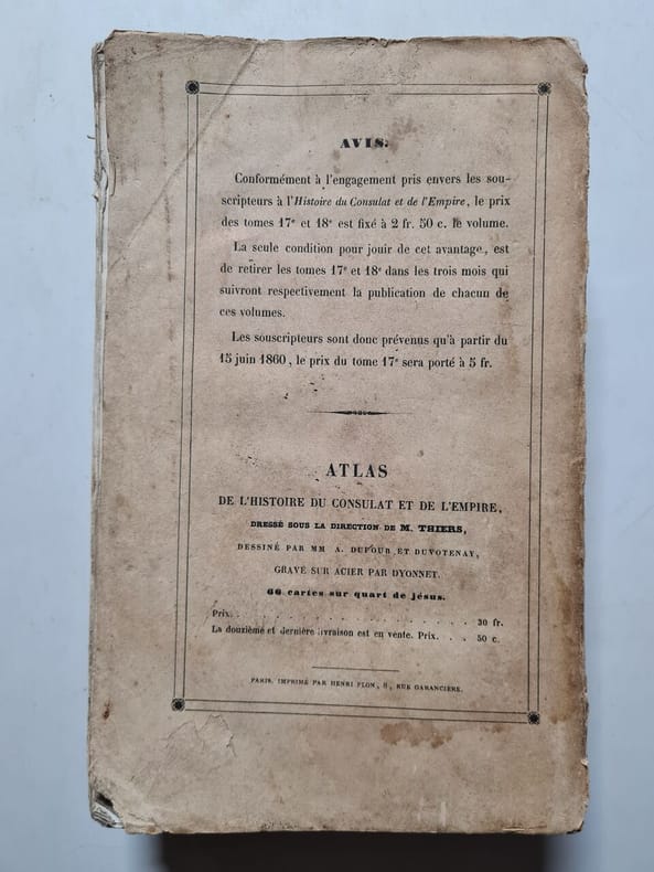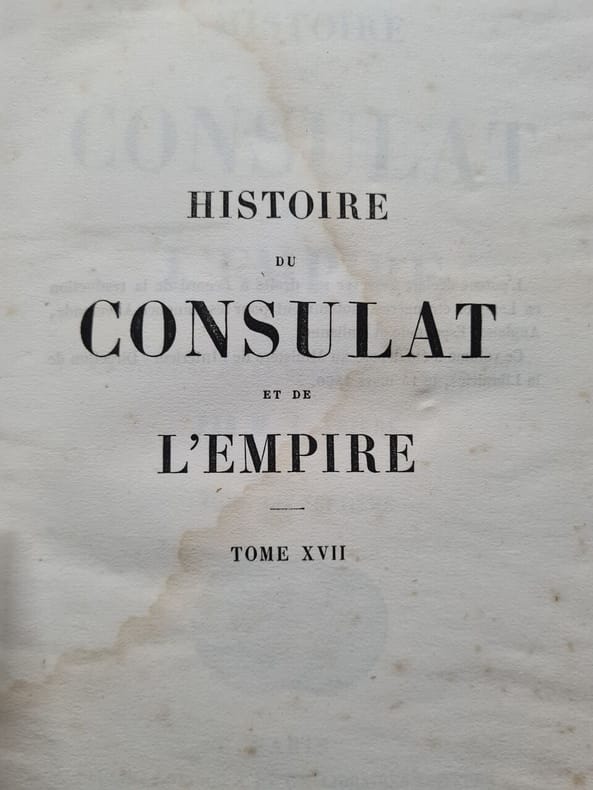 Tome 1. 494 pages. Constitution de l'An VIII, Administration intérieure, Ulm et Gènes, Marengo. Tome 2. 456 pages. Héliopolis, Armistice, Hohenlinden, Machine infernale, Les neutres. Tome 3. 570 pages. Evacuation de l'Egypte, Paix générale, Concordat, Tribunat, Consulat à vie. Tome 4. 620 pages. Les sécularisations, Rupture paix d'Amiens, Camp de Boulogne, Conspiration de Georges. Tome 5. 473 pages. L'Empire, Le sacre, troisième coalition. Tome 6. 573 pages. Ulm et Trafalgar, Austerlitz, Confédération du Rhin. Tome 7. 684 pages. Iéna, Eylau, Friedland et Tilsit. Tome 8. 687 pages. Fontainebleau, Aranjuez, Bayonne. Tome 9. 596 pages. Baylen, Erfurt, Somo-Sierra. Tome 10. 511 pages. Ratisbonne, Wagram. Tome 11. 476 pages. Talavera et Walcheren, le divorce. Tome 12. 709 pages. Avertissement de l'auteur, Blocus continental, Torrès-Védras, Fuentès d'Onoro. Tome 13. 583 pages. Le Concile, Tarragone, Passage du Niémen. Tome 14. 686 pages. Moscou, La Bérézina. Tome 15. 614 pages. Washington et Salamanque, Les cohortes, Lutzen et Bautzen. Tome 16. 693 pages. Dresde et Vittoria, Leipzig et Hanau. Tome 17. 911 pages. L'invasion, Brienne et Montmirail, Première abdication, Conclusion. Tome 18. 656 pages. Restauration des Bourbons, Gouvernement de Louis XVIII, Congrès de Vienne. Tome 19. 637 pages. L'Ile D'Elbe, L'Acte additionnel, Le Champ de Mai. Tome 20. 810 pages. Waterloo, Seconde abdication, Sainte-Hélène. Atlas de la Révolution, du Consulat et de l'Empire. Image disp.