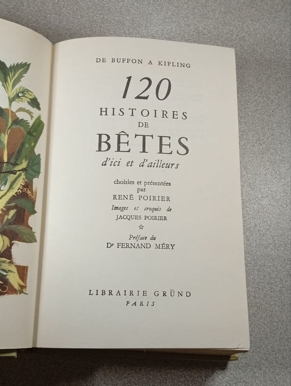 Gründ 1974 in8. 1974. Cartonné. 120 histoires de bêtes d'ici et d'ailleurs choisies et présentées par René Poirier images et croquis de Jacques Poirier - préface du Dr Fernand Méry - de Buffon à Kipling