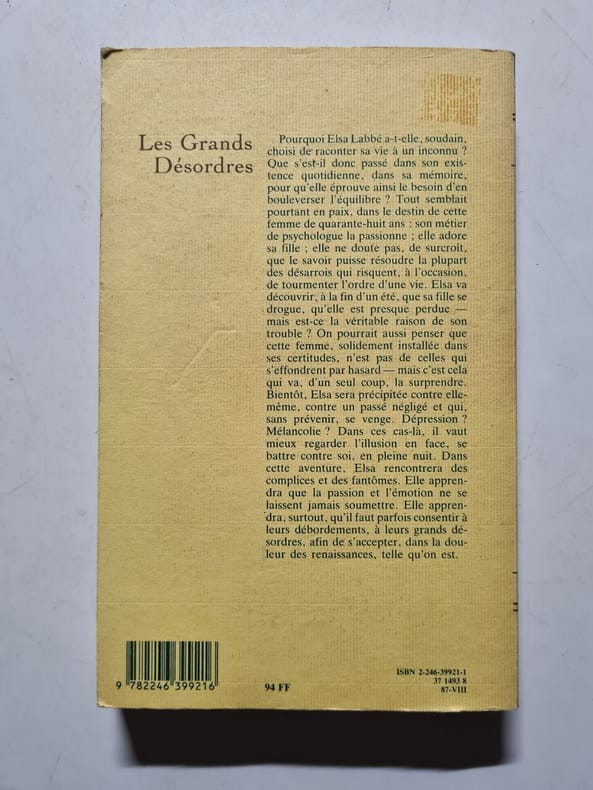 France Loisirs 1988 228 pages in8. 1988. cartonné jaquette. 228 pages. pourquoi elsa labbe a-t-elle besoin soudain de raconter sa vie a un inconnu ? elle a quarante-huit ans son metier de psychologue la passionne ; elle adore sa fille ; elle ne doute pas que le savoir puisse resoudre la plupart des desarrois qui risquent a l'occasion de tourmenter l'ordre d'une vie. elsa a decouvert au retour de vacances que sa fille se drogue qu'elle est presque perdue. mais est-ce la seule la veritable raison de son grand trouble ? on pourrait penser que cette femme solidement installee dans ses certitudes n'est pas de celles qui s'effondrent - mais c'est cela qui va d'un seul coup la surprendre. bient t elsa sera precipitee contre elle-meme contre un passe neglige et qui se venge. depression ? melancolie ? dans ces cas-la il vaut mieux regarder l'illusion en face se battre contre soi en pleine nuit. au cours de cette aventure elsa rencontrera des complices et des fant mes. elle apprendra que la passion et l'emotion ne se laissent jamais soumettre. elle apprendra surtout qu'il faut parfois consentir a leurs debordements a leurs grands desordres afin de s'accepter telle qu'on est