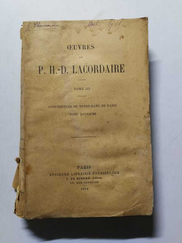 Paris, J. De Gigord 1920-1929 ensemble +/- 4000pp., br.orig. [T.7: page de titre manque], [contenu: T.1.Vie de saint Dominique, T.II-VI. Conférences de Notre-Dame de Paris, T.VII. Considérations sur le système philosophique de m. De La Mennais, T.VIII. Notices et panégyriques, T.IX. Mélanges], R38403