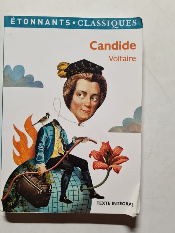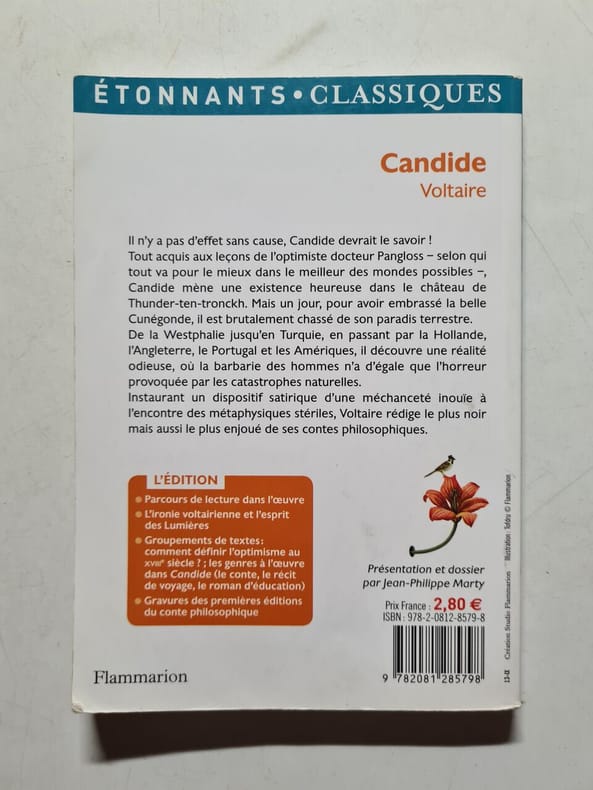 préface de Francisque Sarcey, illustrations de Adrien Moreau Candide est un conte philosophique. Il a pour personnage principal un jeune homme, Candide, qui vit dans un château avec sa cousine, Cunégonde, et son oncle. Il y est éduqué par un précepteur philosophe, Pangloss, qui suit la théorie de Leibniz, philosophe du XVIIe siècle, selon laquelle, notamment, « tout est pour le mieux dans le meilleur des mondes possibles ». Candide adhère d’abord à cette idée ; mais lorsque son oncle le chasse du château après l’avoir surpris en train d’embrasser Cunégonde, la vie va lui faire revoir cette opinion. Candide va en effet traverser une série de péripéties qui seront autant d’épreuves. Il se bat contre les Abares et découvre les horreurs de la guerre ; il assiste à la mort de milliers d’hommes et de femmes lors du tremblement de terre de Lisbonne ; il est condamné à mort injustement et en réchappe comme par miracle ; il découvre la manière cruelle dont sont traités les esclaves noirs, et finit par se réfugier en Turquie. Sur son chemin, il perd et retrouve tour à tour Pangloss et Cunégonde. A la fin du conte, ils vivent tous ensemble en Turquie et se contentent de « cultiver leur jardin », c’est-à-dire de s’occuper de leurs affaires privées sans plus se mêler du monde. « Il faut cultiver son jardin » est en effet le mot final du derviche, un mystique et sage de confession musulmane. Les principaux thèmes de cette œuvre sont ainsi le bonheur, la justice, l’ordre du monde et la politique. volume in-4, 255x170, jolie reliure, dos à nerfs, tranches de tête dorée, bel état intérieur, 174pp, couvertures d'origines conservées, coins lg. frottés, état intérieur neuf. Paris Jules Tallandier ( collection, " Les chefs d’œuvres de l'esprit " ), sans date, vers 1900 ref/241