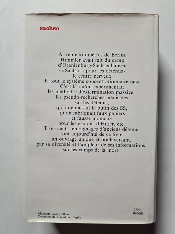 Par l'un de ces paradoxes dont l'histoire est coutumière, le camp d'Oranienburg-Sachsenhausen est sans doute moins connu en France que d'autres bagnes hitlériens, alors qu'il était au cœur même du système concentrationnaire nazi. A trente kilomètres de Berlin, Himmler en avait fait le quartier générale de l'inspection centrale SS qui dirigeait, administrait, surveillait tous les camps. On y expérimentait les méthodes d'extermination massive avant de les appliquer dans d'autres camps, on entassait le fruit des rapines des SS dans toute l'Europe occupée, on se servait odieusement des déportés-cobayes pour des études pseudo-médicales, on camouflait les ateliers de fabrication de fausse monnaie et de faux papiers pour les agents secrets de Hitler, etc. Les quelque 8.000 Français passés dans ce camp, où sont morts la moitié des 200.000 détenus de vingt nationalités qui s'y sont succédé, ne constituent pas le contingent de déportés le plus important de notre pays. Ceci explique peut-être la discrétion observée à leur égard. Pourtant, le caractère spécifique d'Oranienburg-Sachsenhausen confère à leur tragique expérience une valeur toute particulière. Trois cents témoins ont apporté leur contribution à cette œuvre, jusqu'ici la plus complète et la plus diversifiée sur l'histoire des Français dans un camp de concentration nazi. La lecture en est d'autant plus attentive que Sachsenhausen est l'unique camp à être appelé, par les déportés eux-mêmes, d'un diminutif : Sachso. Parce qu'il a été le grand centre de la solidarité et de la résistance internationale contre les SS, Sachso est le défi des hommes en rayé au Sachsenhausen de leurs bourreaux. Rassemblés et présentés par l'Amicale d'Oranienburg-Sachsenhausen, ces témoignages sont de première importance pour une meilleure connaissance de l'univers concentrationnaire nazi. Après "Les Françaises à Ravensbruck", "Sachso" est un ouvrage collectif de déportés français dans un des camps de concentration allemands.
