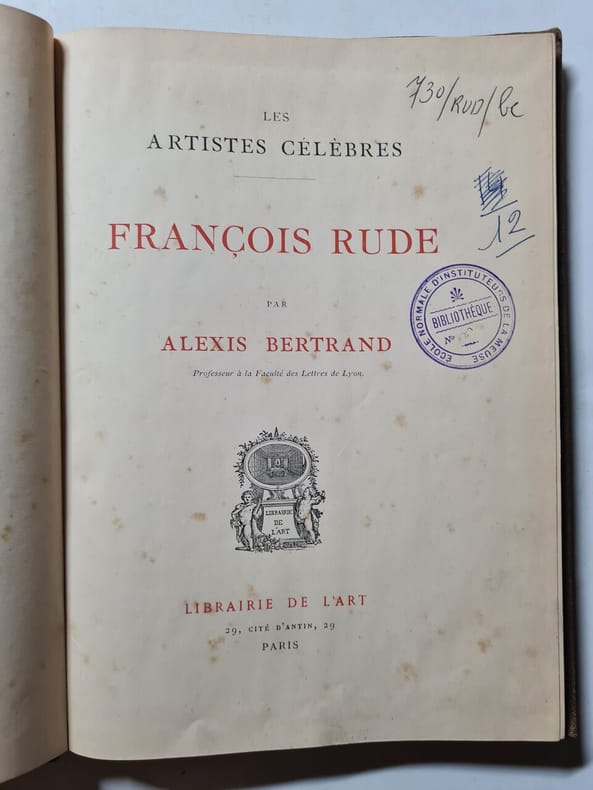 Musée de Dijon, Palais des Etats de Bourgogne, 1947. Petit in-8, agrafé, 27 pp. Introduction - La vie et l'oeuvre de François Rude, par P. Quarré, conservateur du musée - Oeuvres originales conservées au musée de Dijon [25 n°]. - Moulages exposés au musée Rude [26 n°]. - Dessins [167 n°].